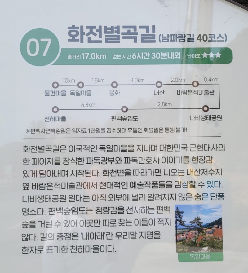 남해 가볼만한곳 베스트10 두 번째, 남해의 바래길7코스-화전별곡길은 이국적인 독일마을 광장을 지나 화천변을 따라 아름다운 풍경이 끊임없이 이어지는 길로 비대면 남해 가볼만한곳 베스트 10 으뜸인 장소입니다. 양떼목장을 지나 내산 저수지 옆 바람흔적미술관에 들러 예술작품도 만날 수 있는데 길이 16.2km이고 쉬는 시간 포함해 6시간 30분 가량이 소요됩니다. 체력에 따라 코스를 조절할 수 있습니다.