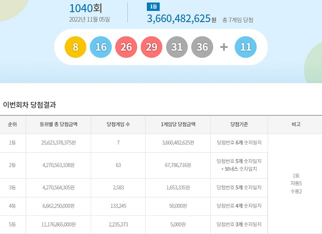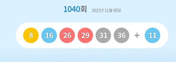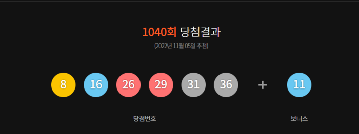 1040회 로또 당첨 번호 : 8, 16, 26, 29, 31, 36 보너스 번호 11