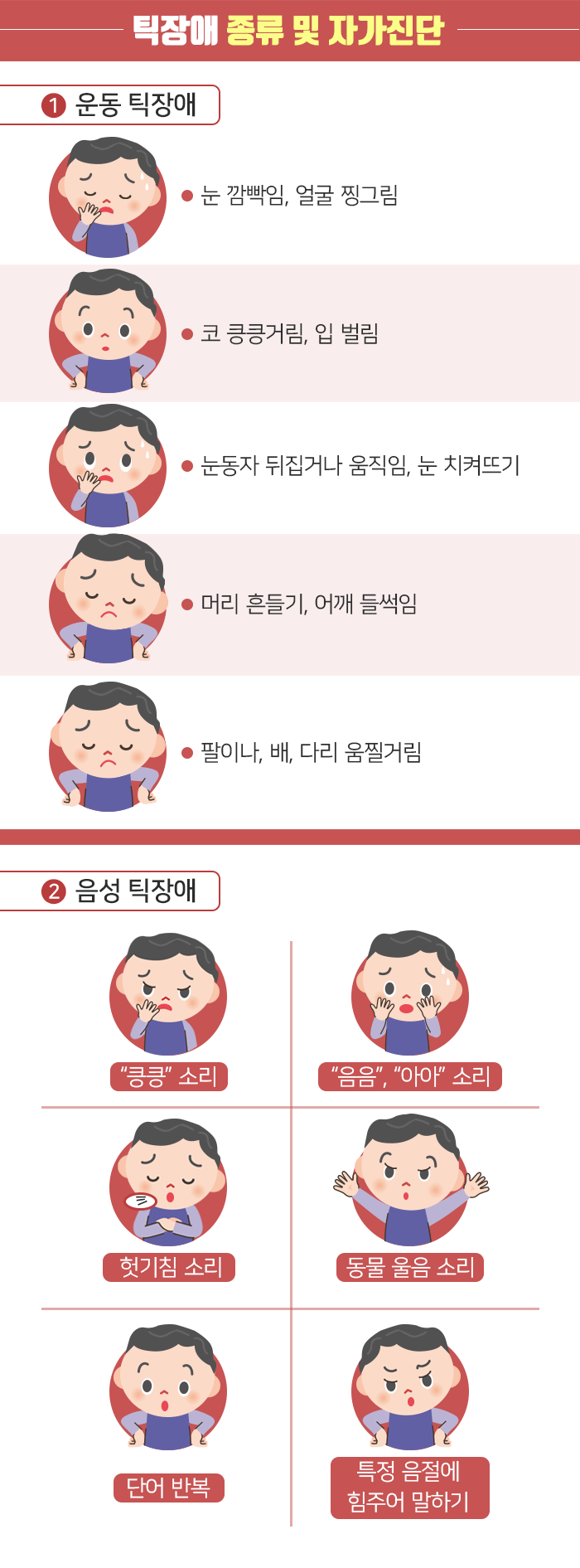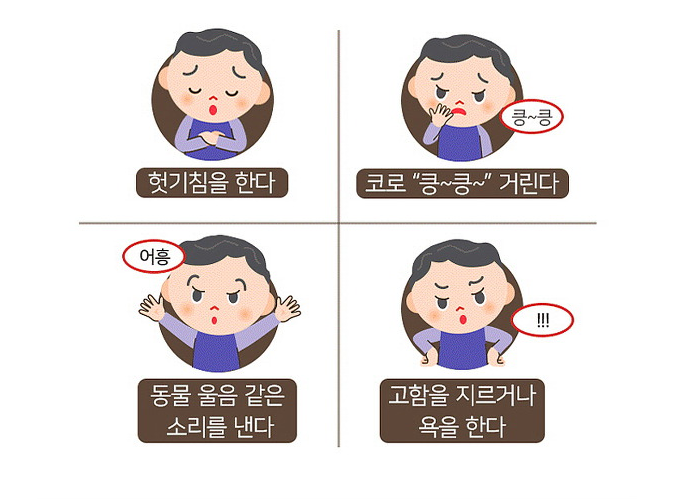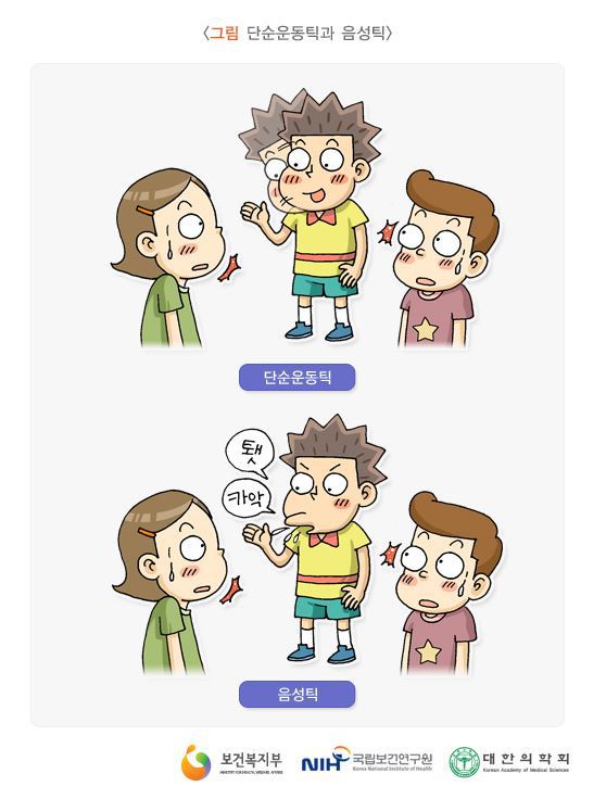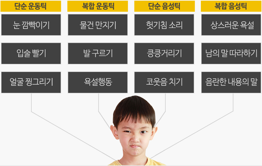음성 틱 : 기침, 목이 가쁘게 끙끙거리거나 앓는 소리, 단어나 구를 반복하는 것과 같은 소리입니다.