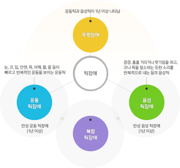 팔다리 및 기타 신체 부위의 움직임을 운동틱이라고 합니다. 킁킁거리는 소리와 같은 비자발적인 반 복적인 소리를 음성 틱이라고 합니다 틱장애는 보통 유년기에 시작되며, 약 5세부터 나타납니다. 대체적으로 여성에 비해 남성에게 더 흔하다고 합니다