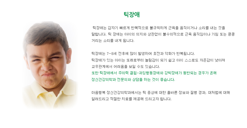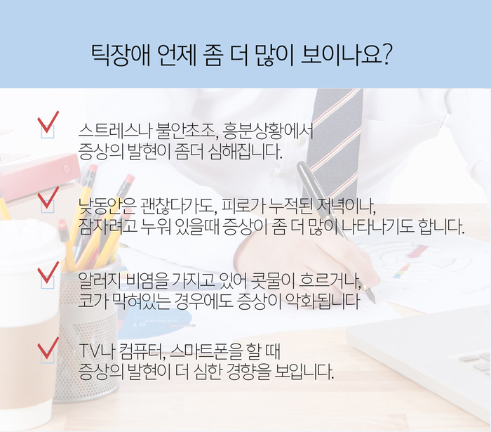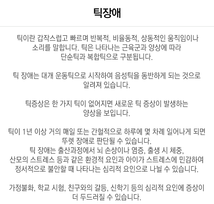 오늘은 틱장애 원인, 증상, 치료방법에 대해서 자세히 알아보도록 하겠습니다.